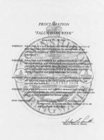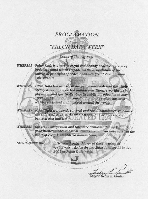 【明慧网2001年1月17日】 加拿大安大略省的泉水镇宣布2001年1月22-28日为“法轮大法周”