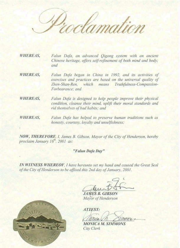 【明慧网2001年1月18日】 内华达州汉得森市市长James B. Gibson宣布2001年1月2日为法轮大法日