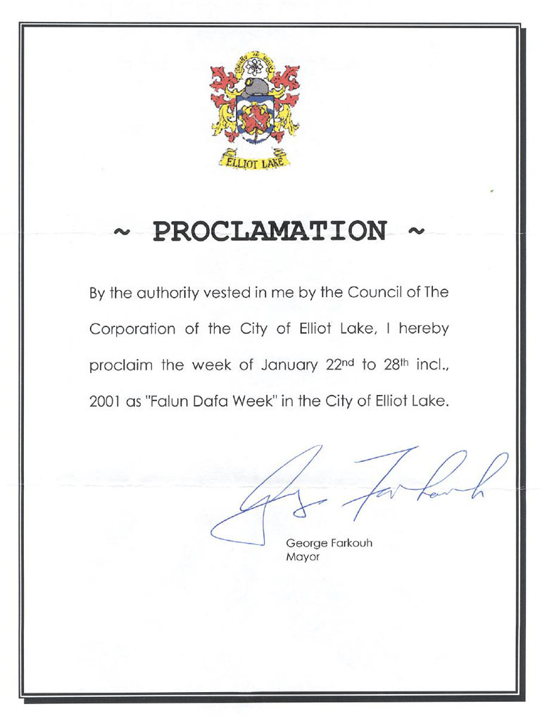 【明慧网2001年1月19日】 加拿大安大略省意里额特湖市市长George Farkouh宣布2001年1月22-28日为"法轮大法周"