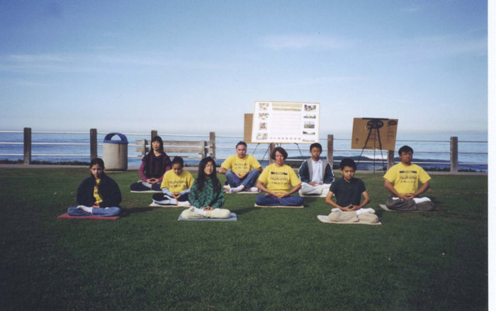 【明慧网2001年1月24日】 每个周末,圣地亚哥法轮功学员都在各个炼功点炼功并义务教功。 La Jolla Cove (拉霍亚海滩) 炼功点的学员更是在海边放摆了法轮大法简介及揭露中国国内江泽民之流对法轮大法学员迫害真相的图版, 祥和优美的功法,色彩鲜明兼图文并茂的照片吸引了很多利用假期到此观光度假的美国及世界各地的游客。