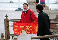大纪元1月25日报道- 一名女子二十五日拿着「法正乾坤」的法轮功标语,在北京天安门抗议,遭到警方拘捕。(美联社图片)