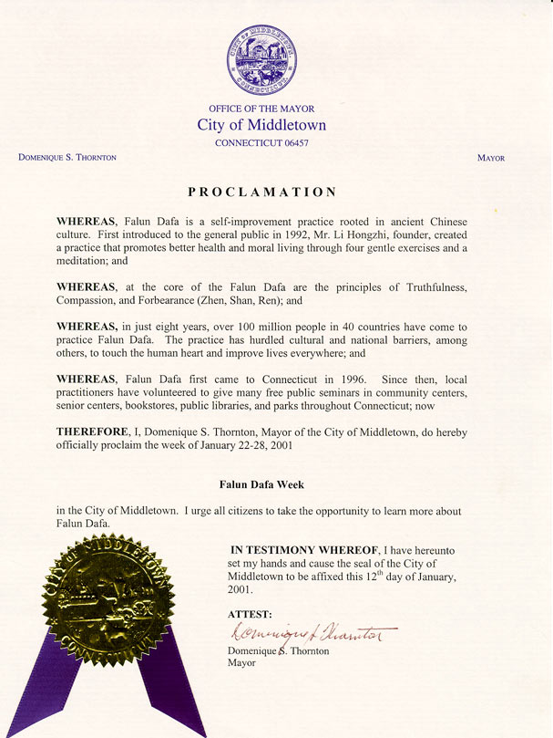 【明慧网2001年1月26日】 康涅狄格州中镇市宣布2001年1月22-28日“法轮大法周”。