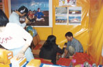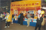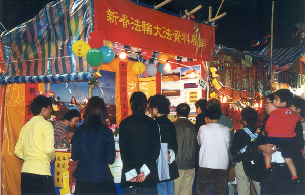 位于荃湾的“新春法轮大法资料展销”摊位显得与众不同,丝网印刷的“真善忍”格外引人注目 荃湾年宵摊档:在展销期间,学员们向游人出售大法书籍,并免费赠送法轮大法的年历、书签、莲花、印有“法轮大法、真善忍”的气球、“真善忍”的挥春和宣传资料“清流”