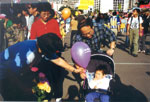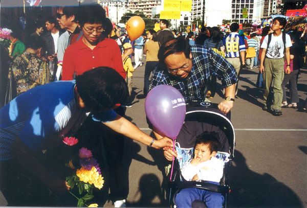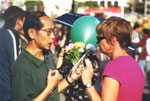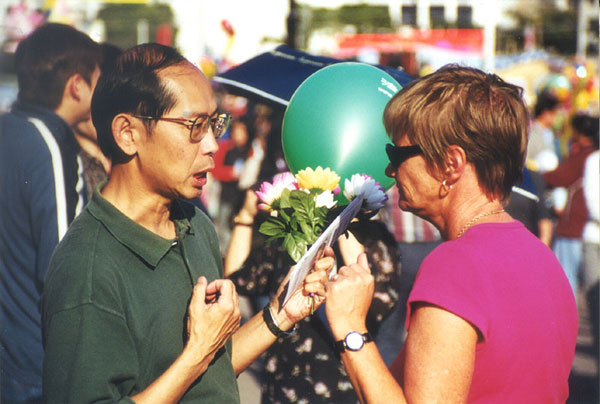 维多利亚公园:大多数家长们愿意接过法轮功的气球和莲花给他们的孩子,有的家长甚至教孩子读出“真善忍”三个字,并提醒孩子要记住“真善忍”。 维多利亚公园:学员向游客洪法