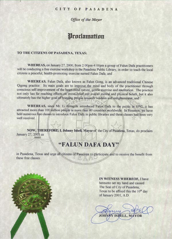 【明慧网2001年1月28日】 得克萨斯州帕萨德纳市宣布2001年1月27日为“法轮大法日”。