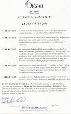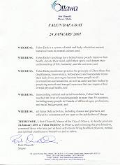 在此 我,鲍布. 舍利 (Bob Chiarelli),渥太华市市长因此宣布2001年1月24日为渥太华法轮大法日,颁发公告,表彰那些参与这些活动,将身体、心灵和精神上的健康带给他们自己和其他人的人们。