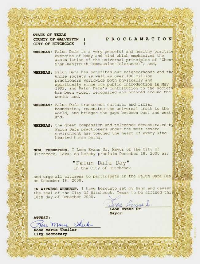 德克萨斯州冈伯雷市宣布“法轮大法周”