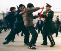 一位妇女大量出血。一个紧搂着母亲的四岁的小孩也被抓上警车。广场上的血迹被迅速抹去。新年除夕,在同一地点,警察把横幅塞进一位妇女的嘴里以使旅游者听不到她的喊声。......十月一日国庆节那天,2000名这一纯中国的教派的成员在天安门嘲弄了XX党。去年政权50周年诞辰时,警方出重手,在北京的大规模游行的全程警戒。三百万居民被要求离开城市。