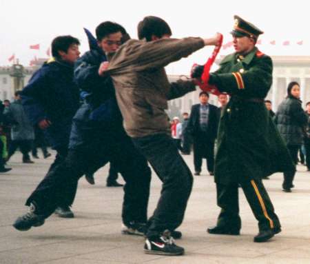 四组主要是上了年纪的妇女的普通中国人突然构成一组抗议的人群,示威者展开他们宣示“法轮功好!”的横幅。几千个士兵把他们掀翻在地,殴打他们,在地上拖扯并逮捕了他们。