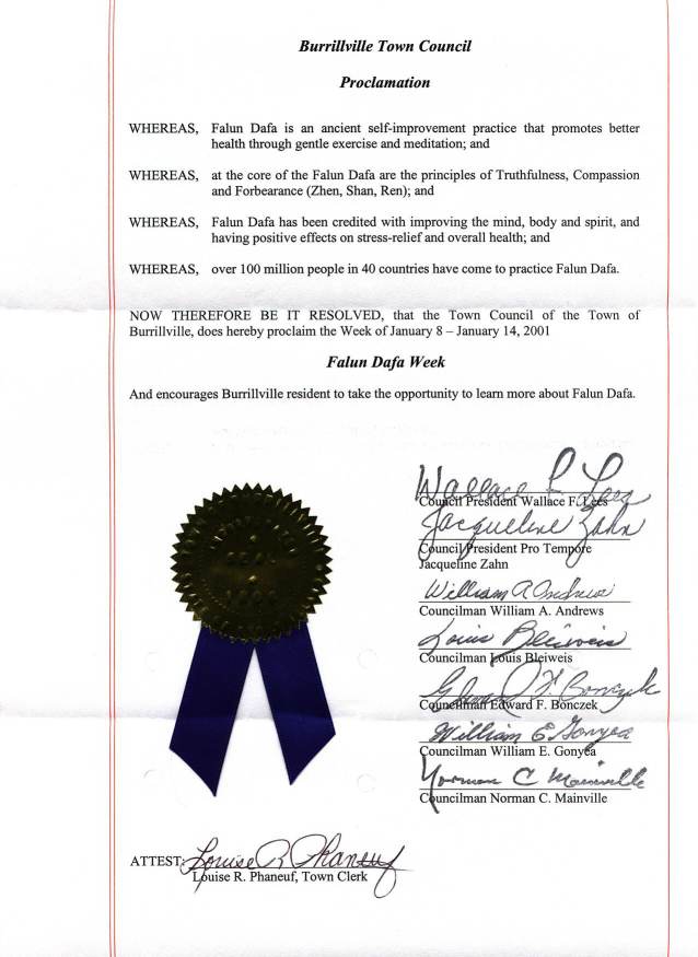 【明慧网2001年1月8日】罗德岛州巴瑞维尔镇宣布2001年1月8--14日为“法轮大法周”