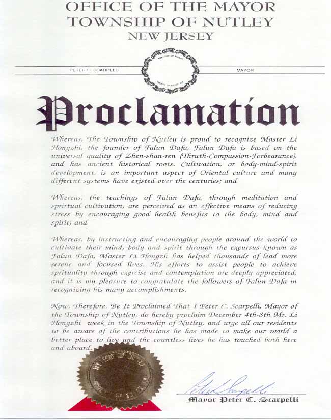 新泽西州纳特立市市长宣布“李洪志先生周”