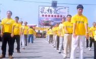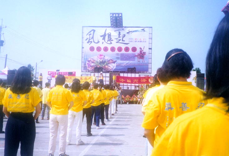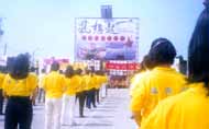 大法弟子百余人于大会的广场下表演五套功法,我们很高兴能够把这千年不遇、万年难遇的功法,带到这么纯朴的地方来,非常希望能够使更多的人得法受益。十点整,大法的音乐从天上响起,大法弟子在酷热的太阳底下,演炼着五套功法,大法弟子展现出了「雷打不动」的真修表现,令大众佩服,大法的威力加上大法粒子与粒子联结起一个庞大的、慈悲的场,整个活动都在很庄严、祥和的场顺利完成,给人们结下了修炼的机缘。