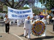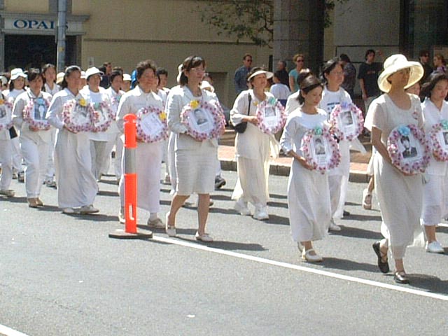 戴着“SOS紧急救援”锦带的步行弟子走在游行队伍的前面。接着是300名身穿白色素装的女大法弟子,抱着贴有被迫害致死大法弟子相片的花环及身穿SOS白色、黄色上衣的大法弟子走在队伍里。大家边走边发正念除恶。游行队伍在“普度”、“济世”大法音乐声中,缓缓前行。游行队伍巨大的祥和、慈悲的正念之场,吸引着众多路人驻足。亦有大法弟子在两边人行道派发大法资料。从人们惊喜的面容,可以看出,他们被这祥和、庄严的场面所震撼。人们纷纷接受大法资料,并签名支持法轮大法。游行队伍最后到达市中心的植物园,并绕公园围成一个大圆环,集体再次发出坚定、纯正的正念,铲除邪恶!