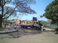 中午12时,开始了“SOS紧急救援”千人大游行。由两位大法弟子抬着“念”字大花环走在队伍最前面。一些弟子举着“SOS紧急救援中国受迫害法轮功学员”、“停止在中国的迫害”、“法轮大法”、“真善忍”等大型横幅,抬着巨型《转法轮》横型,漂亮的大花车装饰着“SOS紧急救援”等横幅,上面坐着8位小弟子、站着8位大法弟子,展示着五套功法。