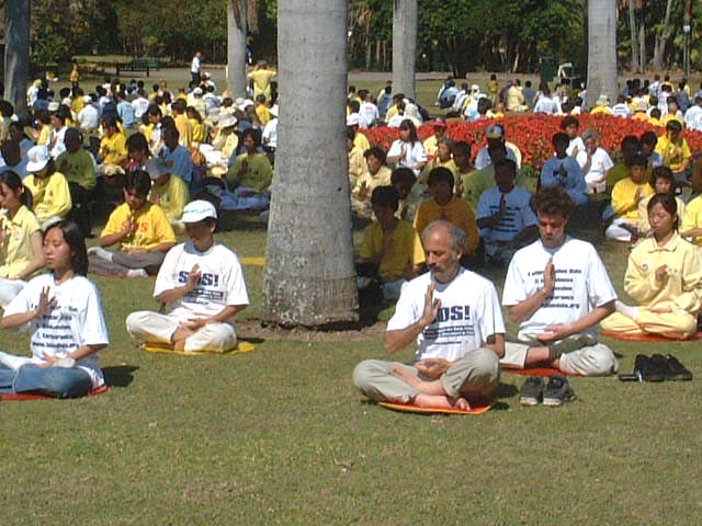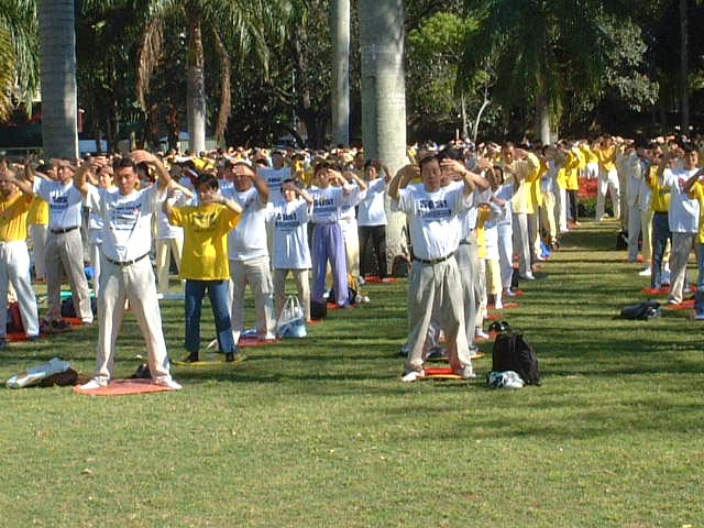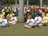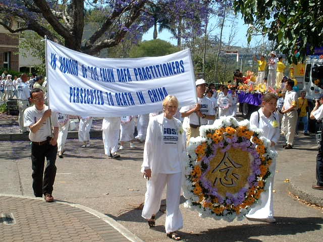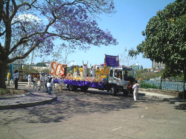 10月5日清晨六时,我们分批乘坐三辆巴士抵达美丽的新农场公园与来自世界其他国家一千多名大法弟子会合。学员们在集体炼完功之后随即整队于九点十五分出发游行。在普渡济世的乐声中同修们有的手持横幅,有的手捧被迫害致死的法轮功学员遗照,有的手举大法旗子……步履庄重地缓缓前进,绵延数里的大法队伍闪烁着金色的辉光,照耀在布里斯本市民的双眼。当我们的游行队伍缓步在市中心时,街道两旁顷刻间站满了人群,肃穆地注视着我们,我知道天上的众神此刻也都在注视着我们。此时此刻,我想到了我们伟大的师父,想到了中国大陆舍生护法的可敬同修……,内心顿时百感交集、泪水又不禁潸潸落下,大法弟子参与正法是何等的神圣!