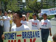 当从悉尼到布里斯本“SOS紧急救援长途步行”小组步入会场时,许多弟子瞬时泪流满面,全场爆以热烈的掌声,步行弟子向大家挥手致意。大会举行了对步行者到达的欢迎仪式。几个小弟子给步行弟子戴上花环及写有:SOS从悉尼走到布里斯本字样的蓝色锦带。场面感人。
