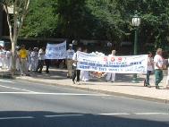 有功友获悉今天中国代表团将分散在几处活动,于是大家便兵分几路,一部分学员前往国会山,一部分去了白宫,另一部分则到了约翰霍普金斯大学。在约翰霍普金斯大学,学员们机智地找到了中国代表团车辆的必经之处,静静地等候他们的到来。当一载有几名中国官员的汽车驶到大学门口时,车里的人看到学员后,没敢停车,不得不继续向前滑行了大约一百米。学员们一字排开,展开横幅,举起小展板,单手立掌于胸,面向他们发出强大的正念。车里的人似乎在商量对策,一直未开门让代表们下来,持续了几分钟后,有两名负责接待的美国人走了出来,看看我们,又看看那辆车,出于外交礼貌,只好示意司机驶向学校的后门。学员们抓住机会向那两名美国人讲清真相,并将手中的酷刑迫害的展板展示给过往的人们。一小时以后,那几名代表出来了,生怕和学员进行任何的正面接触,匆匆钻进车子,学员们试图上前递交一封公开信,那名司机竟然跳下来辱骂学员。真不明白,他们为什么对和平请愿的法轮功学员如此恐惧和愤恨。