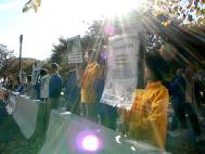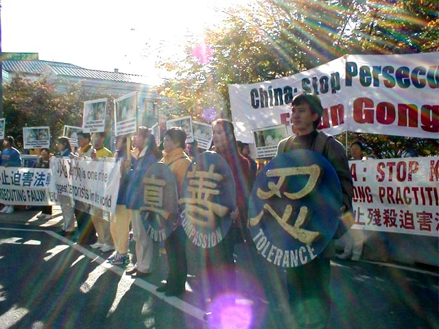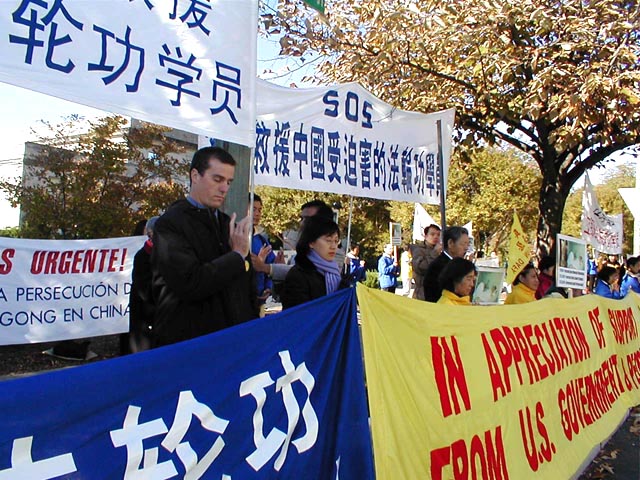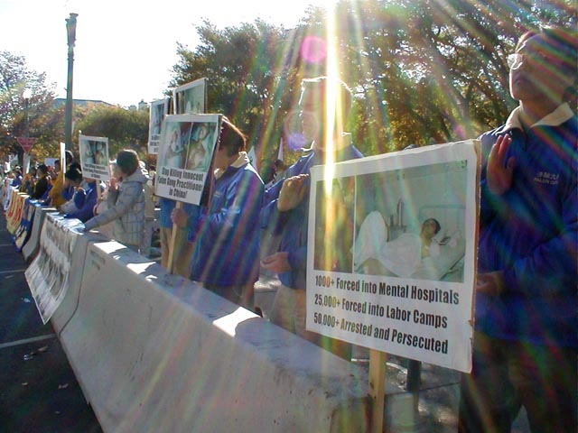 【明慧网2001年10月11日】今天(10月10日)是中美人权对话的第二天,学员们继续举行抗议活动。虽然昨天学员们都从早上8点起一直站到下午5点,晚上又参加了烛光守夜活动,但大家不顾劳累,仍然一大早便赶往国务院。