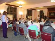 十月三日晚,讲座开始前的十五分钟,应克里斯的要求,我们反复播放着大法音乐《普度》和《济世》。八点一刻,人们陆陆续续从唱诗班走进举办讲座的会议室,先到的人有的观看展板,有的选取有关法轮功的资料,有的和法轮功学员交谈。讲座开始了,一位学员简要介绍了法轮功洪传的历史,功法的特点,以及中国政府江泽民集团对法轮功镇压的真相。接着播放了《法轮大法从历史中崛起》电视片片段。电视片中学员们优美的炼功动作,慈悲祥和的表现,恶警残暴的迫害等情节紧紧抓住了观众的心。随着情节的转变,人们由点头到不断的摇头,直至有人落泪。