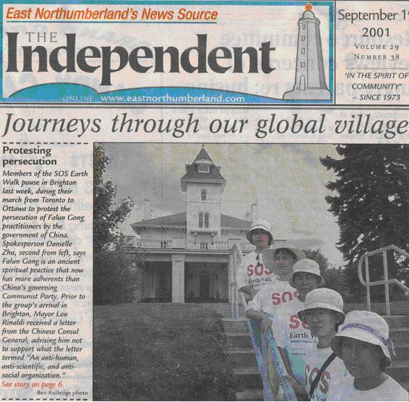 【明慧网2001年10月19日】加拿大独立报2001年9月19日在头版刊登了步行法轮功学员的照片,并载文介绍学员的步行情况。