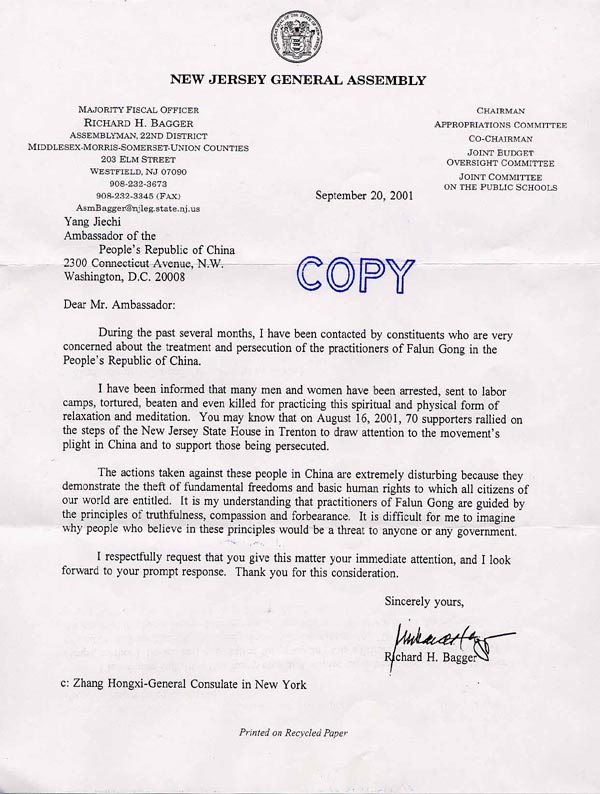 【明慧网2001年10月2日】9月20日,新泽西州众议员百格先生致信中国驻美大使,对中国法轮功学员的根本自由和基本人权所受到的践踏表示愤慨和不解。百格众议员在信中说:我认为法轮功学员是以“真善忍”的准则为指导的。很难令我相信以这些准则为指导的人们会对任何人或任何政府构成威胁。