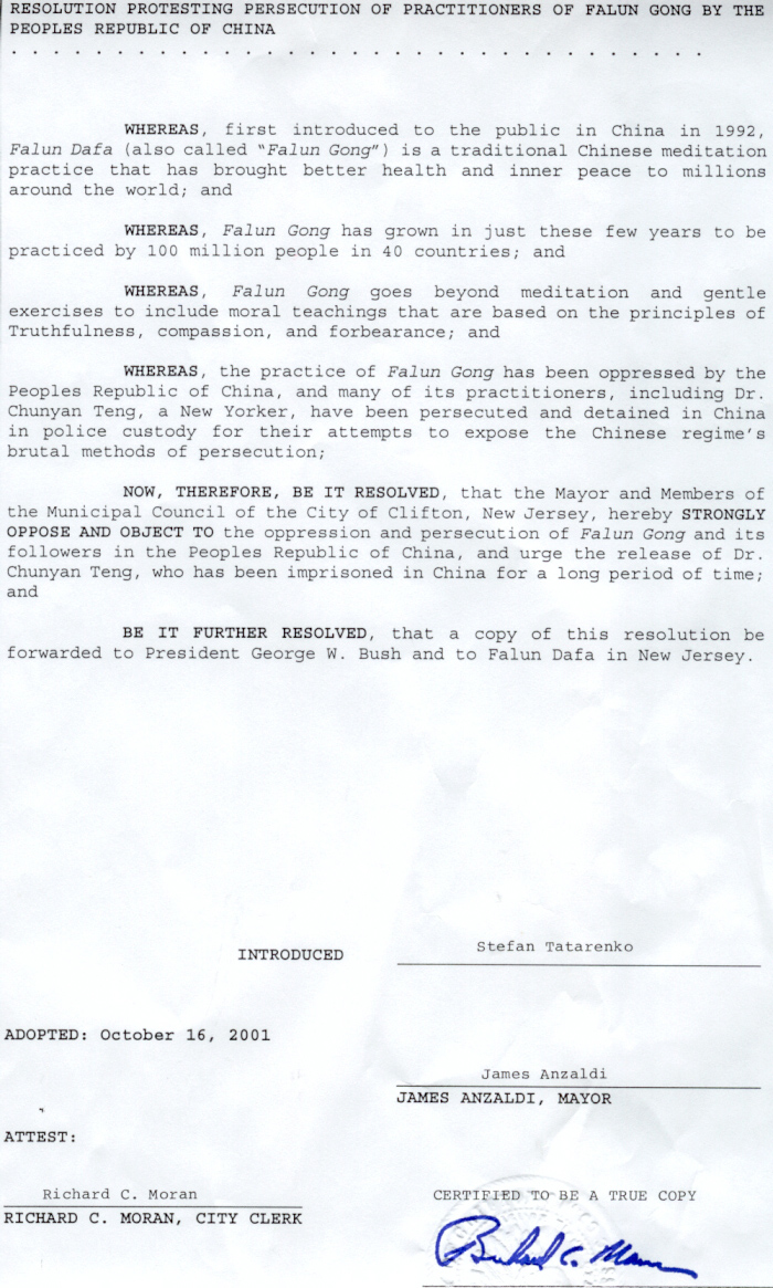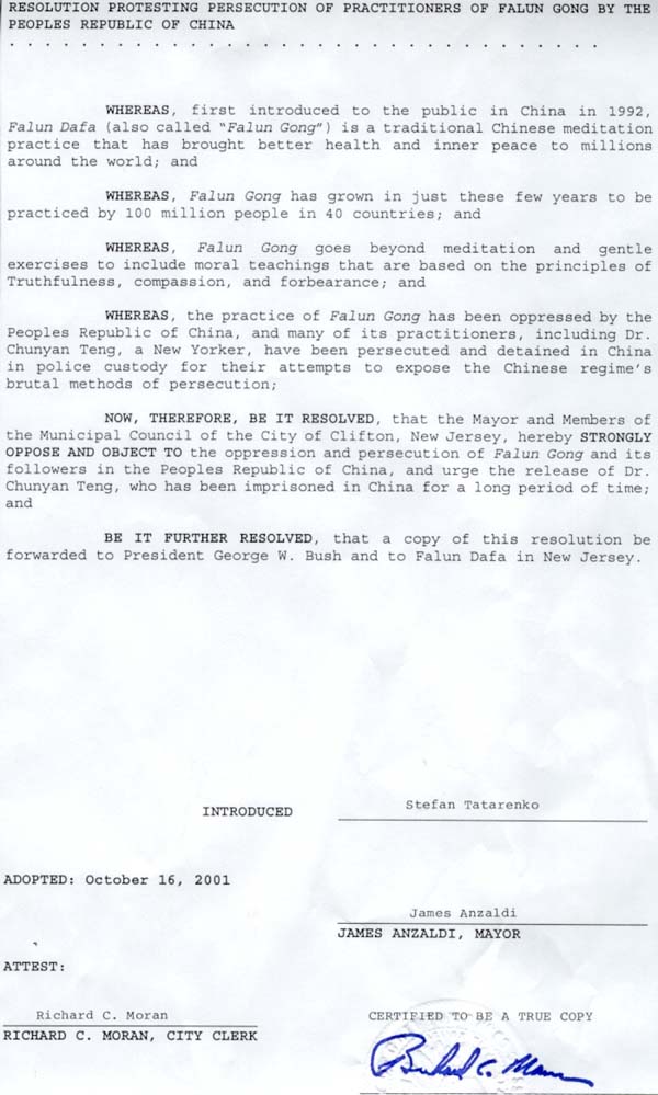 【明慧网2001年10月27日】2001年10月16日,新泽西州克里夫顿(Clifton)市市议会在市政厅召开大会,市长和全体议员一致表决通过了“抗议中华人民共和国对法轮功学员迫害的决议”。