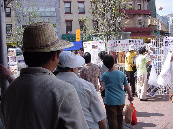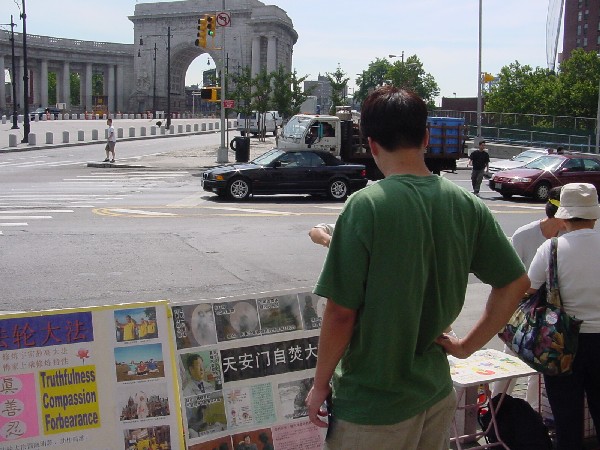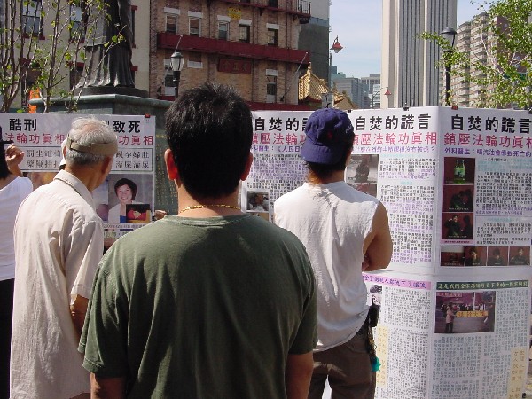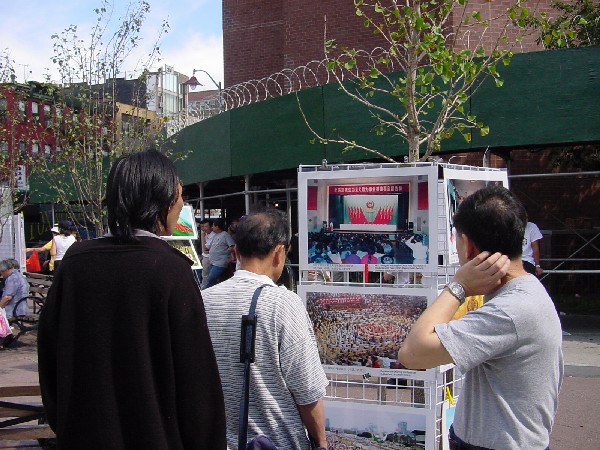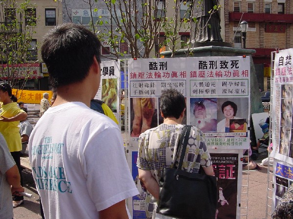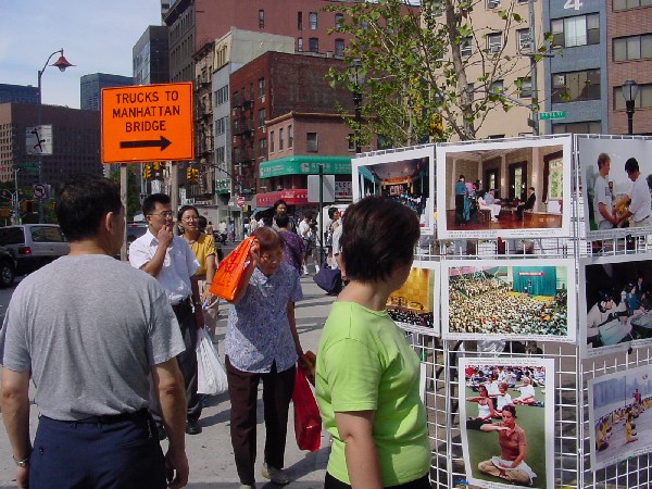 【明慧网2001年10月28日】由于部分纽约华人受中共的反面宣传的毒害很深,不知道法轮功的真象,对大法及学员十分反感甚至敌视。在这法正乾坤时刻,为了进一步讲清真象,救度世人,大纽约地区学员继上周在曼哈顿哥伦布公园成功举办大型图片展后,8月18日又在中国城最繁华地段之一---孔子像广场,举行大型图片展览和洪法讲真象活动。
