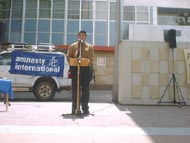 在结束“大赦组织行动日”活动时,该活动组织者、一位西人女士说:“祝你们一切成功”。