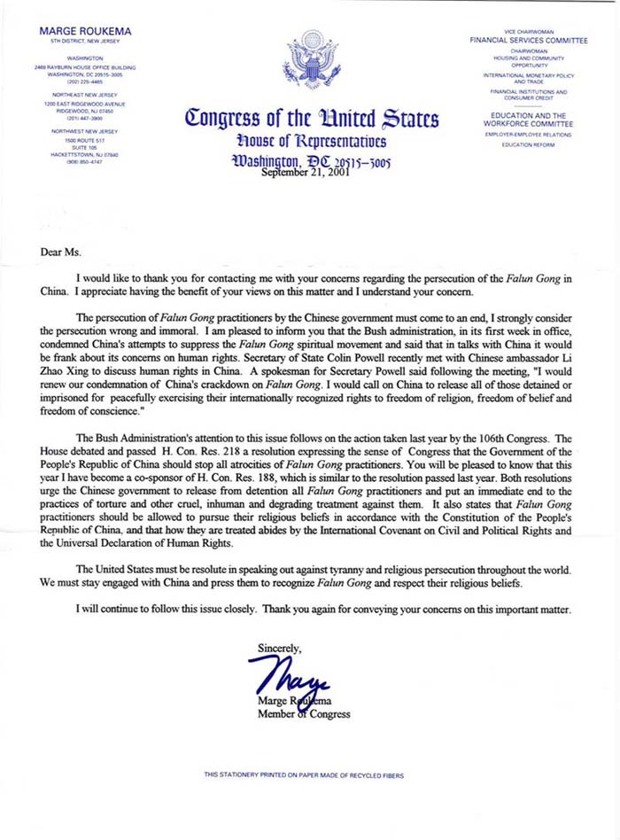 中国政府对法轮功修炼者的迫害必须结束,我强烈认为这场迫害是错误的和邪恶的。我非常高兴地告诉你,布什政府在刚刚当选执政的第一个星期里,就谴责了中国政府对法轮功精神运动的镇压,并且表示将在与中国政府的对话中坦率地表达对中国人权问题的关注。国务卿科林·鲍威尔最近会见了中国大使李肇星,讨论了中国人权状况。会谈结束后,国务卿鲍威尔的一位发言人指出,“我要继续谴责中国政府对法轮功的镇压。我要呼吁中国政府释放所有因和平行使世界公认的宗教自由、信仰自由以及良心自由的权利而被关押的人。