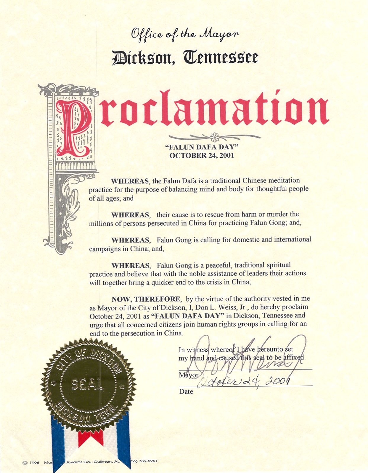 在此,作为迪克森市市长,我,丹.魏斯,特此宣布10月24日为田纳西州迪克森市的“法轮大法日”,并敦促所有市民加入人权组织,呼吁制止发生在中国的这场迫害。