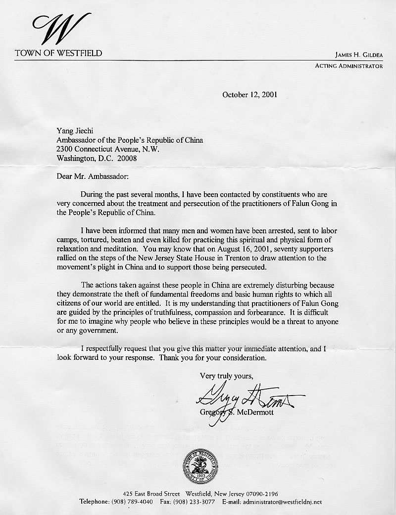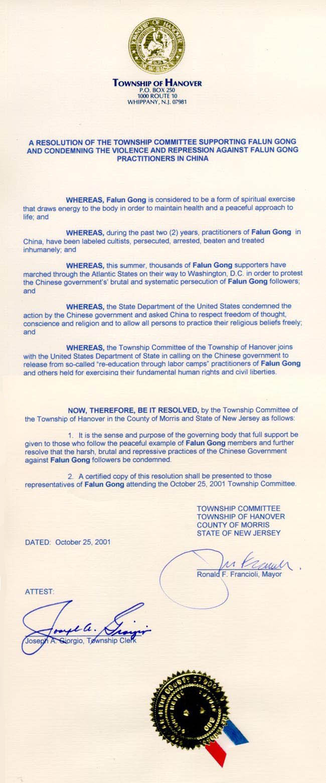 【明慧网2001年10月29日】最近,我们新泽西州的许多弟子参加了一些美国当地市政府的会议(COUNCIL MEETING OR COMMITTEE MEETING),呼吁市政府支持法轮功,紧急救援大陆法轮功学员,谴责江泽民政府残酷迫害法轮功的罪恶行径,并由市政府把有关决议、呼吁信等抄送中国政府有关领导人和中国驻美使领馆负责人。此举收到了很好的效果。其间弟子们有一些体会和感悟,这里写出来与同修们分享并希望得到指正。