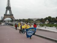 我们从巴黎第三区出发,行经巴黎圣母院,经过行人密集的香榭里大道,通过凯旋门,最后到达巴黎的象征建筑-埃菲尔铁塔。由于我们举着醒目的SOS!紧急救援环球步行的标语,引起了人们很大的注意,询问和尊敬。一路步行,一路正法,一路发紧急救援真相传单,人们很容易接受传单。世人在纷纷醒悟,误解在迅速消除。特别是在法国,由于当地媒体经常直接引用中国政府的宣传报导,很多市民对法轮功确有相当程度的误解。我们的步行恰到好处和自然地把迫害真相告诉世人。一天下来,发了很多很多的传单,既说明了真相,又给世人留下了一个和平、善良、真诚,坚韧的法轮功学员形象。