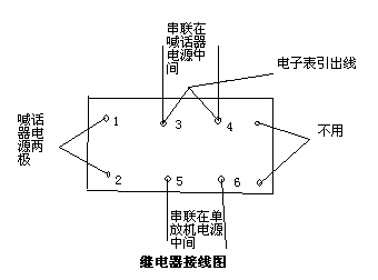 2、 将这两根线接在继电器的3、4上,再从3、4上引出两根线,另一端焊上铜箔用绝缘材料隔开,串联到喊话器的电源中间。作为喊话器的控制开关。