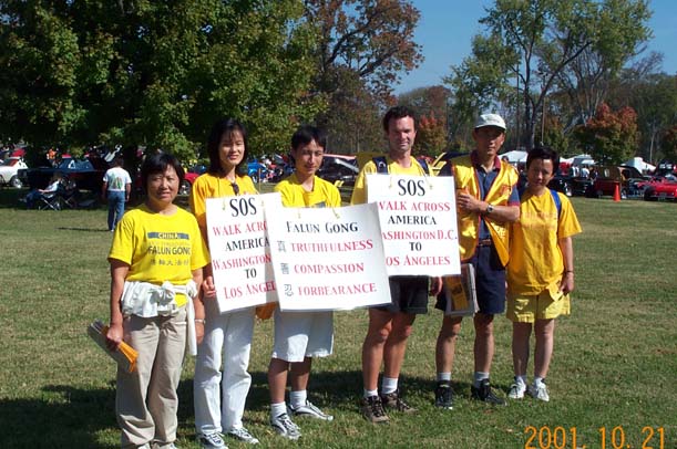 【明慧网2001年10月30日】休士顿大学的越裔学生发起了“为美国而行走”的运动,于10月28日上午在休大校园内举行,休士顿大法弟子得知后,认为这是一个向休士顿大学的师生们洪法讲真相的好机会。于是,大法弟子们早晨七点半到达休大校园内,向主办单位展示法轮功功法。不久,部分越裔弟子得知消息,也赶来与华裔弟子一道炼功,这群祥和的炼功人立刻吸引了参加行走活动的人们的注意。