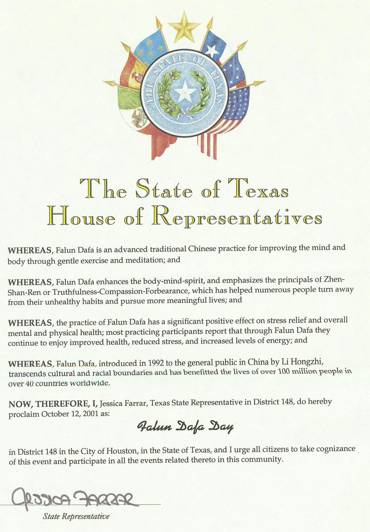 现在,因此,我,杰西卡.法拉,德州第148区议员宣布2001年10月12日为休斯顿市第148区“法轮大法日”,并号召所有居民认知这一事件及参加所有有关活动。