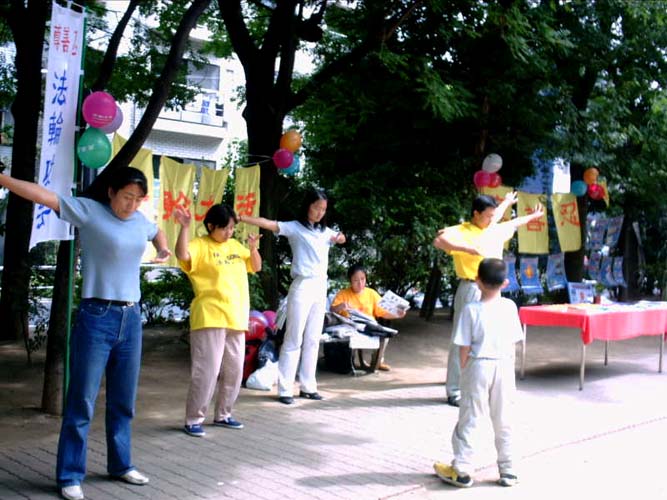 许多人驻足观看我们的录像带,彩色教功图片,及我们日本法轮功学员纵贯日本的SOS步行图片。几乎所有的来客问的第一个问题都是:中国为什么镇压法轮功?当我们告诉他们,因为江泽民将法轮功庞大的修炼人数当作对他们权力的威胁,而实际上是一种幻觉时,许多人表示了理解。当我们展示国内法轮功学员被残害的照片,许多参观者表现出了愤慨。更有一些,比如说本来受中国政府宣传对大法误解的一位阿姨,通过交流,明白了真相,表示要到炼功点来学。还有一位看过报纸的会场负责人走过来对我说,“我对中国当局撒谎非常厌恶,请到我们房间给每一人发一份报纸。”