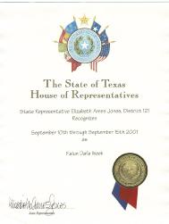 德克萨斯州众议员Elizabeth Ames Jones嘉奖“法轮大法周”(2001年9月10日至15日)。
