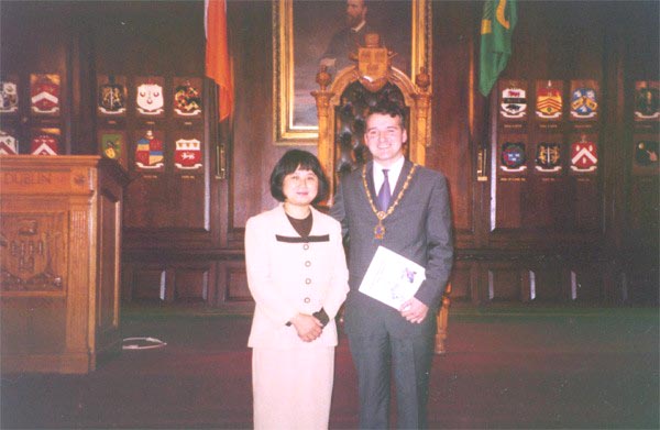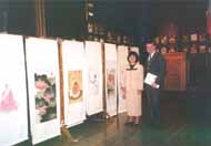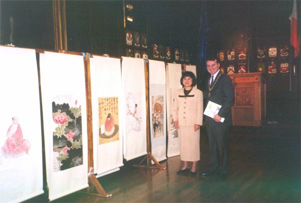 【明慧网2001年10月5日】9月28日,德国的画展刚结束,章翠英又带着她的60多幅绘画艺术作品风尘仆仆地从欧洲大陆来到了爱尔兰这个欧洲最西部的偏远的岛国。她的60多幅绘画作品展示在古典优雅的都柏林市长办公厅的橡树堂,这是以前都柏林市长举行正式仪式、接见来访者、授典的地方。大厅宽敞、凝重、庄严,正面的一个高大的座位凸现在前边的台子上,象极了中国古代的结构。章翠英的绘画作品排列在房间的两侧,从释迦图到醉八仙;从孔子问礼到李时珍采药图;从唐宫仕女图到普通的山水,处处表现了她的画风的高雅和返朴归真。水墨兼工笔,山水并人物,透露着她修炼大法秉承真善忍的原则。