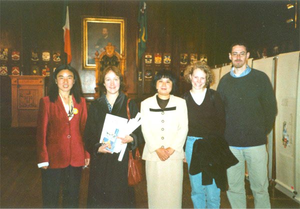 和都柏林副市长加利.奇甘先生合影加利.奇甘先生浏览章翠英的绘画作品欧洲议会议员帕翠莎.摩肯女士(左二),都柏林三圣学院研究生会秘书伊丽莎白.德路小姐(右二)、主席布莱恩.麦克沙利先生(右一)参观画展