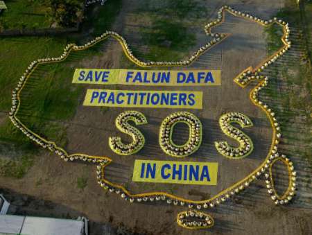 为唤起全球关注“SOS紧急救援中国法轮功学员”,法轮大法(又称法轮功)的学员们于2001年10月5日在昆士兰黄金海岸的防波堤用身体摆出“中国”地图。