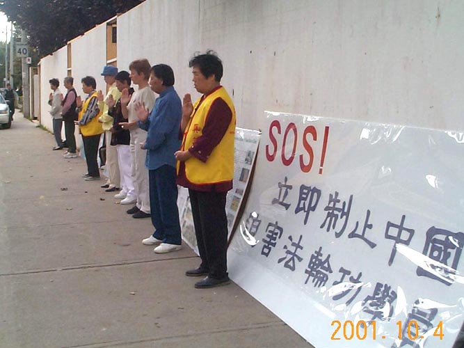 【明慧网2001年10月6日】一年多来在多伦多中国总领馆前一直进行着大法弟子和魔之间的较量。为了证实法的伟大,师父的伟大,为了还我法轮大法的清白,抗议江泽民之流在中国大搞恐怖活动,制止罗干之流对法轮功学员的大肆虐杀和逐步升级的迫害,我们多伦多大法弟子无论是风雪弥漫的寒冬,还是风雨交加、骄阳似火的酷暑,坚持每日上午在领馆前那块草地上炼功,请愿,也曾在那里绝食、静坐、发正念,召开新闻发布会等等,有力地窒息了邪恶,同时让更多的世人了解了事实真象,救度世人。