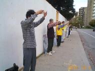 大法弟子正念铲除邪恶,自来水龙头竟然自动地转向,直喷领馆,拒绝往大法弟子身上浇水了,充分显示了大法弟子正念的威力。总领馆气急败坏又无奈,绞尽脑汁以施工改建绿地为名,用高达8英尺的白色木板将领馆前圈住,这种见不得人的领馆形象在世界上恐怕还绝无仅有呢。
