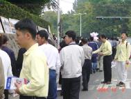 游行那天二十位大法弟子一大早就到达了集合地点,因为离游行还有两个多小时,所以我们就集体炼功和发正念。在那里就属我们的音乐声最大,连在一百公尺外都可以听到炼功音乐。前来参加游行的学生好奇地围观过来,当场跟着我们一起学功,我们感到很高兴!我们同时给在场集合的各游行队伍发真象传单,一会儿就看到几乎人人手上都拿着传单,整个操场上一片“佛光普照”。