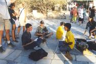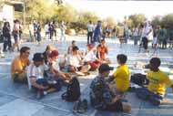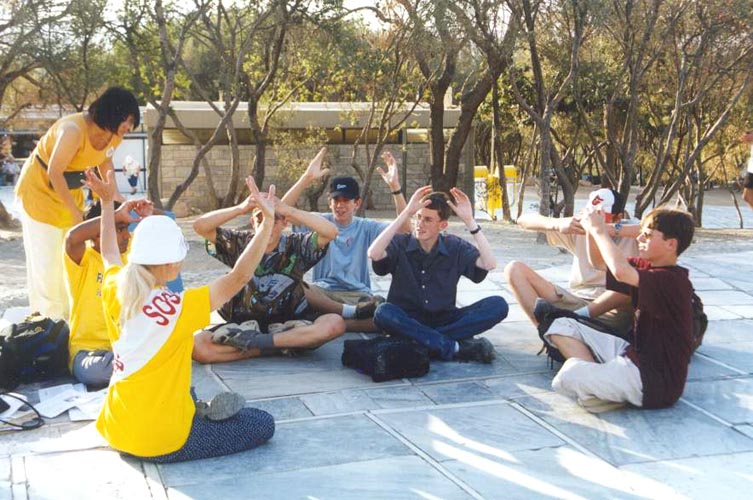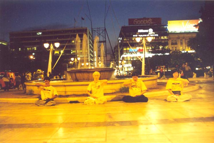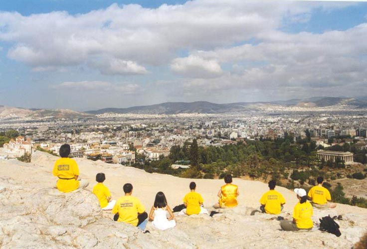 一出机场就见到了举着“真,善,忍”和“法轮大法”字样小黄旗的希腊青年瓦西里笑眯眯的迎上前来。大家好象是久别重逢的亲友,格外高兴。到达旅馆后,稍作整理,学员们顾不得旅途的疲劳,立即带上大法材料走向雅典市中心。这时天已黑了,学员们身穿金黄色T恤衫,在灯火辉煌的市中心显得格外耀眼。雅典市民们都被这耀眼的黄色吸引了,加上学员们脸上真诚的微笑,真相材料大批发出。更巧的是,这天晚上我们遇到了很多中国人,原来希腊最近有一次大赦,很多中国人为了得到身份,从不同的国家汇聚到这里。由此他们得到了更珍贵的大法真相材料。更有感兴趣者,要求立即学功,买书,这真是他们的缘份。