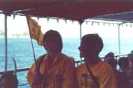 从船上开始,学员手托资料上上下下先走一圈。船刚启动不久,已看见几乎人人都在阅读法轮功的真相材料了。期中又遇到了十几位中国人,他们读了报并询问如何长期订阅,并愿意与拿小旗的学员拍照留念。每到一个小岛,学员们排成一队由举旗的领队绕小岛一周,顾不上天气的炎热和曝晒,把大法材料带到了小岛上的家家户户。