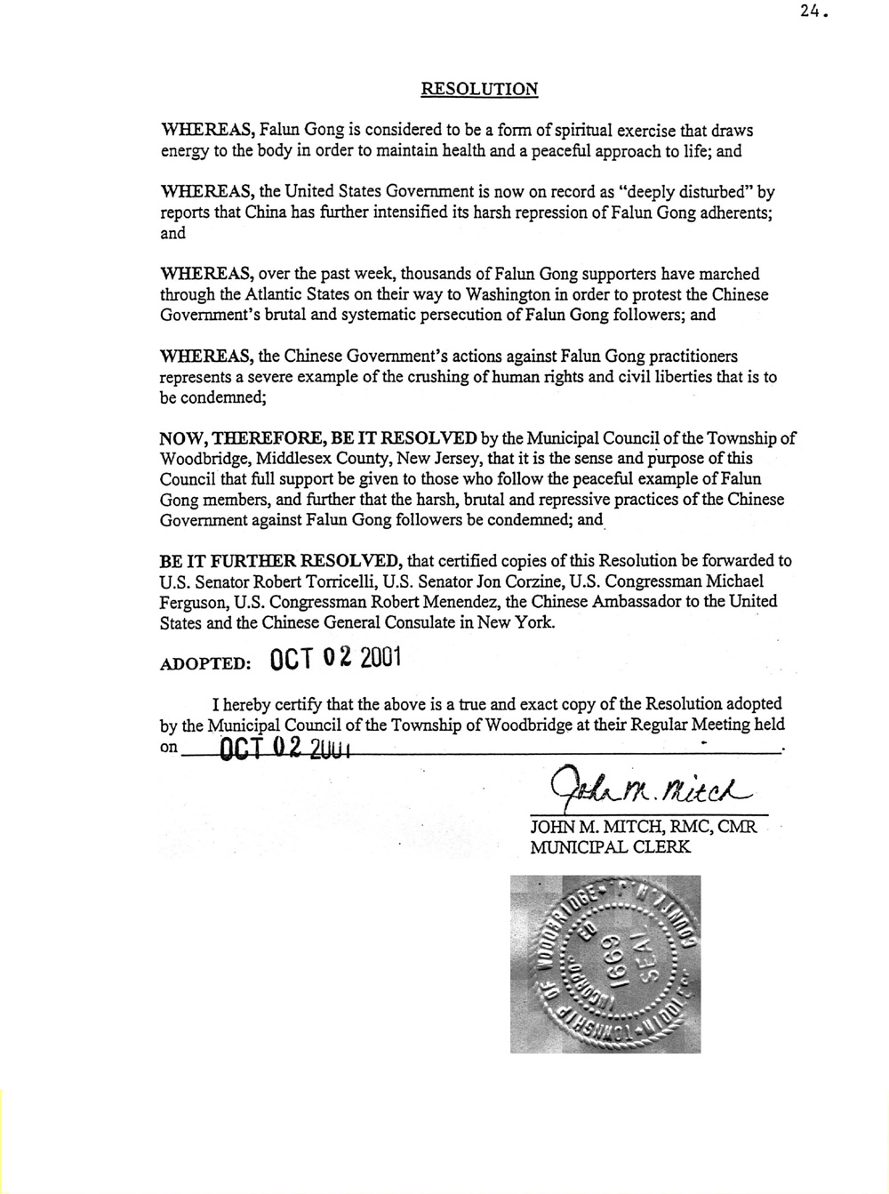 因此,现在,新泽西州,米德赛郡木桥市政府议会一致决议,愿意全力支持和平的楷模法轮功修炼者,并进一步谴责中国政府对法轮功的野蛮镇压与迫害行为。