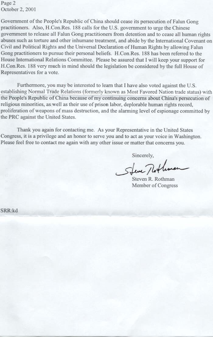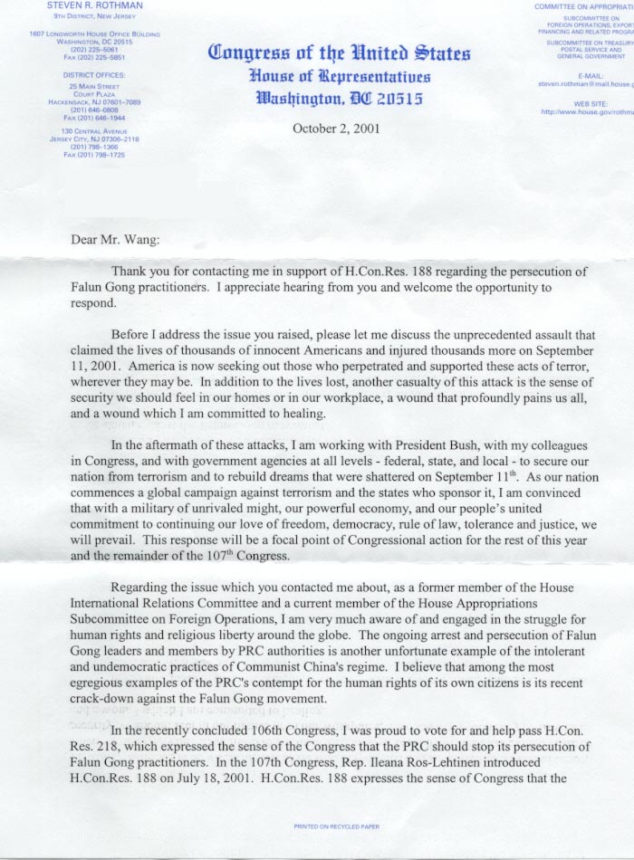 【明慧网2001年11月1日】2001年10月2日,新泽西州国会议员史蒂夫.罗斯曼(Steve Rothman)先生致信法轮功学员,谴责中国江泽民政府对法轮功学员的。罗斯曼议员在信中说:“正在进行中的中国当局逮捕和迫害法轮功领袖及其成员的行为是中共当局又一个非容忍及非民主的不幸范例。中国当局对法轮功的镇压是其蔑视本国公民人权的一个最臭名昭著的例子。”“在最近结束的第106届国会上,我非常自豪地投票赞成并帮助通过了美国国会要求中国停止对法轮功学员迫害的218号决议。在第107届国会上,国会议员Ileana Ros-Lehtinen于2001年7月18日提出了第188号决议。在该决议案中,美国国会要求中国政府停止对法轮功学员迫害。188号决议还呼吁美国政府要求中国政府释放所有被监禁的法轮功学员,停止诸如折磨和其它非人性的践踏人权的行为,及遵守《国际民权和政权条约》和《人权公约》,允许法轮功学员追求他们的个人信仰。目前188号决议已提交到众议院国际关系委员会。一旦提交全体众议院表决,我将全力支持它的通过。”