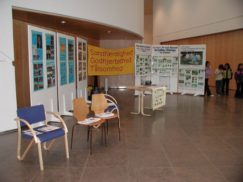 事先,我们未及进行电话预约,但是文化宫的负责人还是热情地接待了我们,并爽快地为我们提供了周末两天的办展场地。并承诺在文化宫贴出广告,负责联系媒体,在当地广播台播出通知。事情出乎意料地顺利!真的是师父的慈悲安排,我们马上给因工作在丹麦还未启程的一位弟子打电话,带上我们所有的洪法,讲真相图片。同时我们仍然登门拜访了各家新闻媒体,送真相资料,预约采访。
