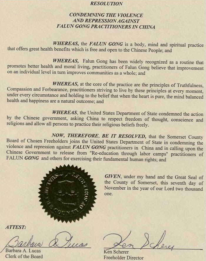 新泽西州萨么赛特郡政府一直尊重和支持当地的法轮功学员,与学员们保持着良好的关系。