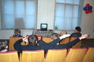 上午一群东方艺术中心的学生在老师的带领下来参观画展,其中有个孩子把我领到大佛的画像前,好奇地问了很多问题。参观后,他们的老师邀请我们第二天去他们艺术中心教他们炼功,我们欣然接受了邀请。
